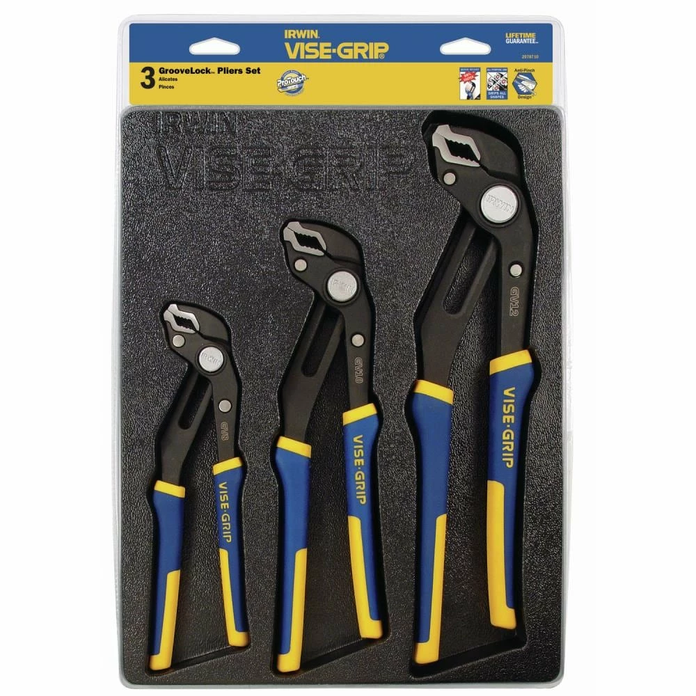 This IRWIN VISE-GRIP GrooveLock 3-Piece Pliers Tray Set includes 8-in, 10-in and 12-in GrooveLock pliers, as well as a storage tray. Each set of water pump pliers is designed with a press-and-slide button that quickly adjusts the lower jaw. This all-purpose jaw grips on round, flat, square and hex shapes. With ProTouch grips, the pliers are easy and comfortable to hold during projects.