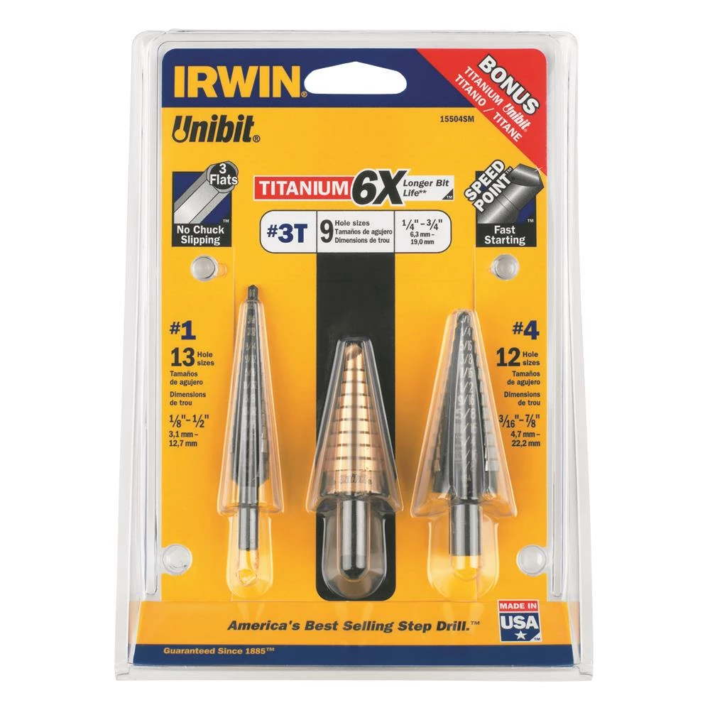 - Unibit #3 cobalt contains a 3/8-in hex shank and contains 9 hole sizes- 1/4-in-3/4-in (1/16-in steps)